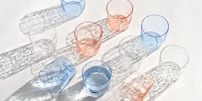 Poháre z fúkaného skla FABINI & Tomáš Kučera 200 ml. Základom kolekcie je najpoužívanejší kus každodenného stolovania. Dvojica pohárov s objemom 200 ml má tenké steny, ktoré príjemne sedia v rukách a umocňujú dojem ľahkosti. Dostupné sú v troch farbách – svetlo ružovej, modrej a čírej.