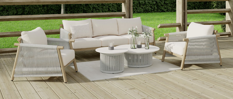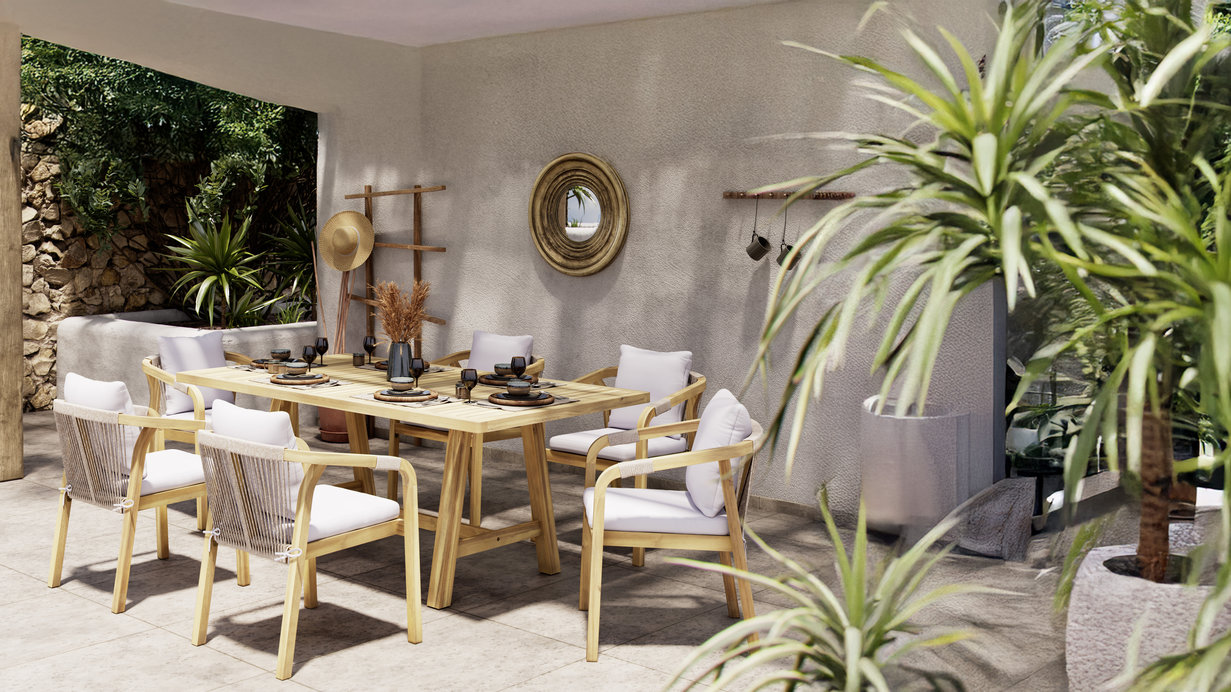 Veľmi obľúbená je dnes aj kombinácia prírodného materiálu a moderného kovu, ktorá prináša teplo prírodného vzhľadu aj praktickú odolnosť. Súprava kombinuje masívne akáciové drevo s hliníkovou konštrukciou a kvalitnými vankúšmi.
