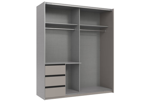 Dva posuvné dverné panely uľahčujú manipuláciu aj tam, kde nie je dostatok miesta na klasické otváranie, zatiaľ čo vnútorné členenie s policami a šatníkovými tyčami poskytuje dostatok priestoru pre oblečenie aj doplnky. Praktickým detailom sú aj zásuvky, ktoré pomáhajú udržať drobnosti prehľadne usporiadané. Skriňa Heide sa tak prirodzene hodí