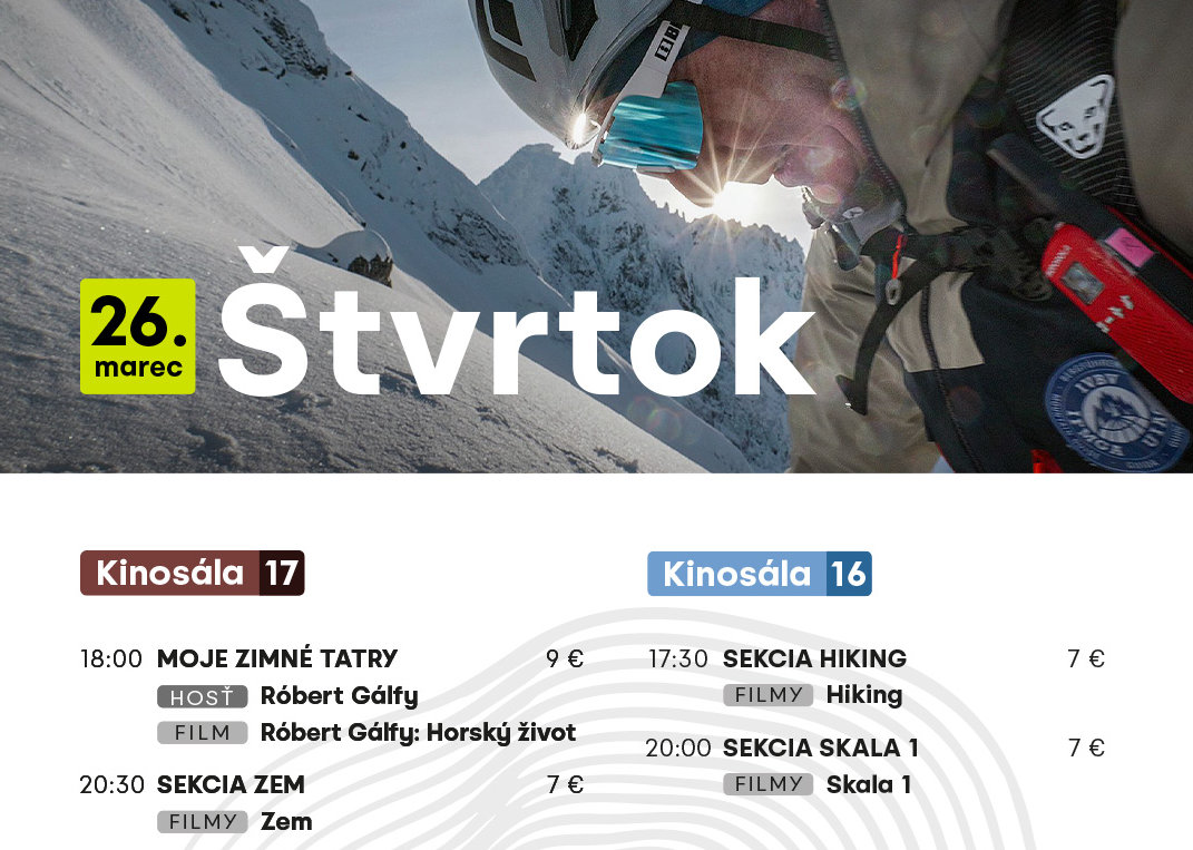O 18:00 sa v kinosále 17 začne program, na ktorom privítame hosťa festivalu Róberta Gálfyho. Prednáška Moje zimné Tatry bude o skialpových kombináciách, v ktorých Róbert spája skúsenosti z vodcovstva, lezenia a pretekárskeho skialpinizmu. Každá túra je pre neho skladačkou, kde má svoje miesto výstup na lyžiach, lezenie či zaslúžený zjazd. V tomto programe môžu návštevníci vidieť aj film – výborný dokument Rasťa Hatiara – Horský život, ktorého hlavnou postavou je práve Róbert Gálfy.