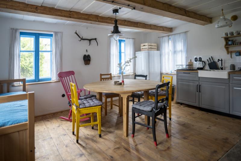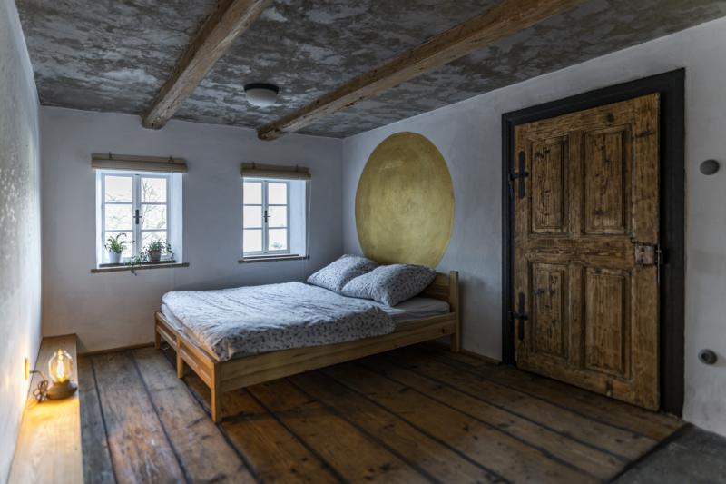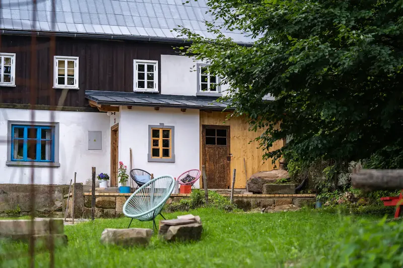 Zrekonštruovaná chalupa je ideálna pre 8 hostí. Dostať ju do tejto podoby chvíľku trvalo, majitelia si museli najskôr vyhrnúť rukávy. Čo už nahlodal zub času a nebolo možné zachrániť, nahradili novými materiálmi, ktoré však s pokorou nadväzujú na pôvodný ráz a charakter stavby. Všimnite si hlinené omietky na hrazdených stenách. Sú natretné vápnom a sklárskou farbou, keďže práve sklárstvo má v tomto regióne dlhú tradíciu. Pocit bezpečia a ticha znásobujú nové drevené okná. Sú presnou replikou starých, no dnes už spoľahlivo izolujú od chladu aj vonkajšieho sveta. Pôvodné okná sa už nedalo zachrániť, boli rozpadnuté, ale majitelia sa rozhodli zachovať ich starého ducha.