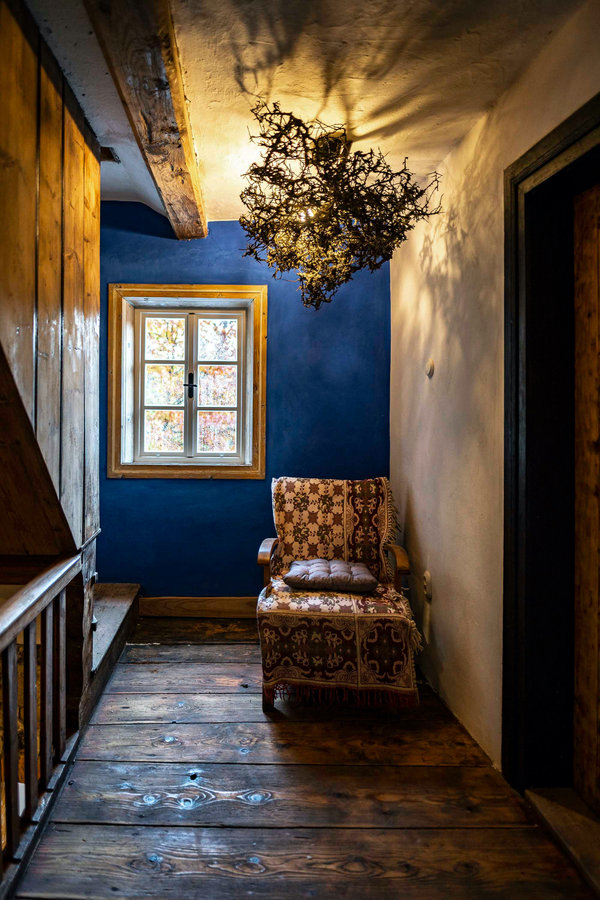Steny s priznaným hrazdením dýchajú vďaka hlineným omietkam, ktoré sú ošetrené vápnom a tradičnou sklárskou farbou – nenápadným odkazom na bohatú históriu miestneho remesla.