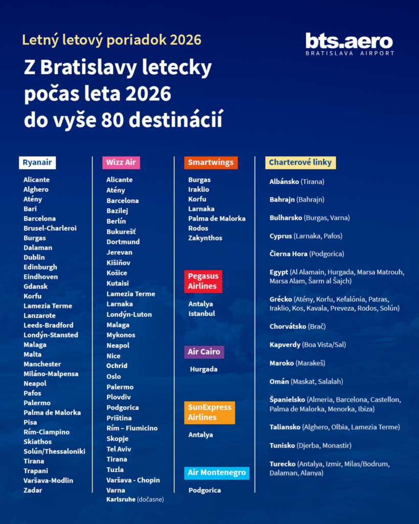 Dovolenkári si budú tento rok letné dovolenky organizovať jednoduchšie – v ponuke sú priame lety z Bratislavy do populárnych letných letovísk, akými sú napríklad grécke ostrovy Mykonos či SkiathosNice na franúzskom Azúrovom pobreží, chorvátsky Zadar, španielska Malaga, Alicante či Barcelona, talianska Lamezia Terme, Sicília i Sardínia, bulharská Varna, Burgas či Cyprus a ďalšie, čo ocenia individuálni cestujúci.