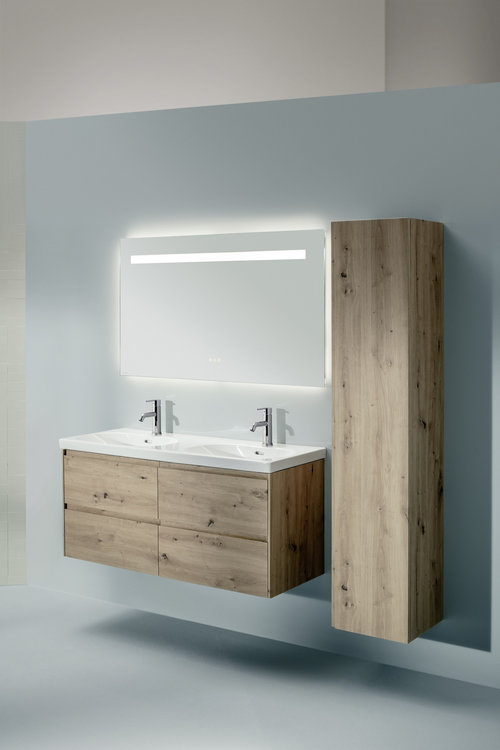 Nadčasový nábytok LANI v prevedení divoký dub vnesie do interiéru hrejivosť a navodí pocit domova. O štedrý úložný priestor umývadlovej skrinky sa starajú 2 až 4 zásuvky so spomaleným zatváraním, integrovanými úchytkami a vo vnútri sú navyše doplnené o praktické organizéry. Závesné skrinky obsahujú sklenené poličky a dvierka s tichým dovieraním. Okrem prevedenia v divokom dube sú dostupné aj v bielej alebo sivej traffic.